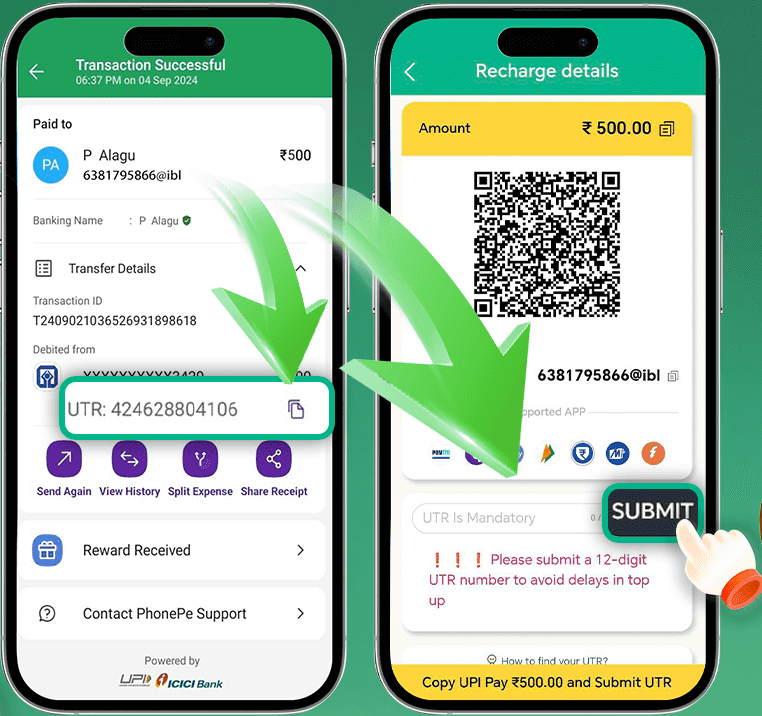 Return to 9Get payment page and find UTR section. Enter the UTR number and click “Submit.” This completes your deposit.